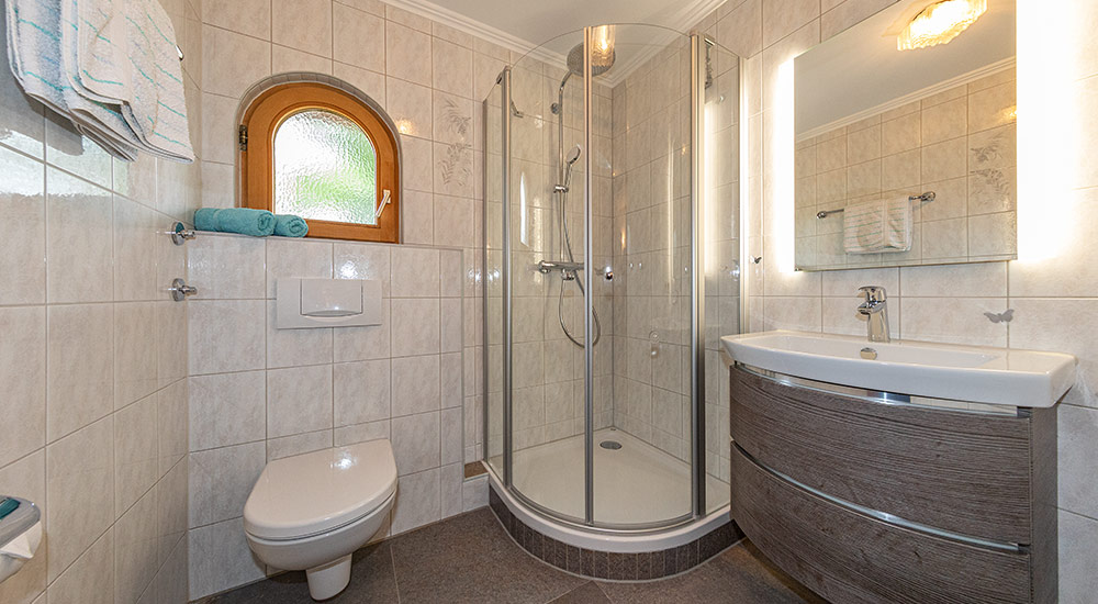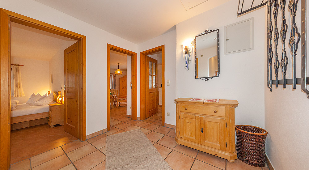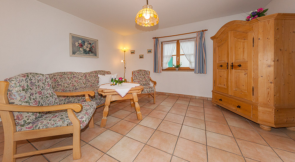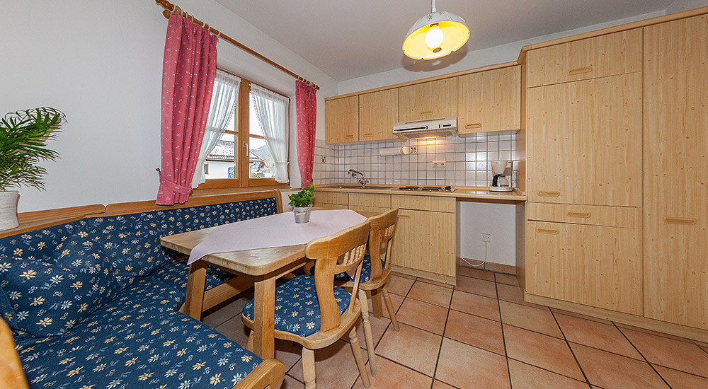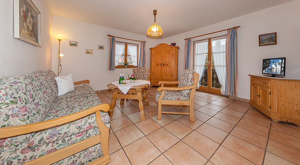 Die im ländlichen Stil eingerichtete Ferienwohnung ist ausgestattet mit einem gemütlichen Wohnzimmer, abgetrennten komplett eingerichteten Einbauküche (E-Herd mit 4 Kochplatten), separates Schlafzimmer, Dusche/WC und Südbalkon mit Blick auf Karwendel und Wetterstein.