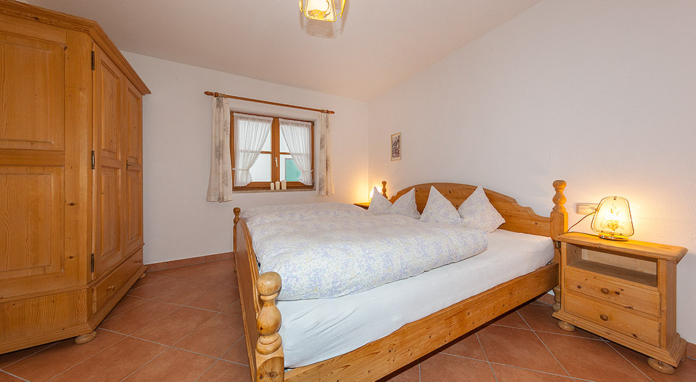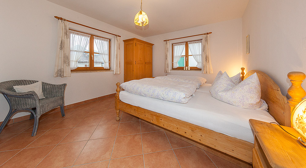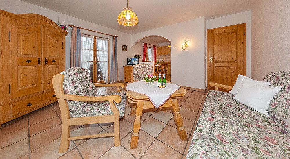 Die im ländlichen Stil eingerichtete Ferienwohnung ist ausgestattet mit einem gemütlichen Wohnzimmer, abgetrennten komplett eingerichteten Einbauküche (E-Herd mit 4 Kochplatten), separates Schlafzimmer, Dusche/WC und Südbalkon mit Blick auf Karwendel und Wetterstein.